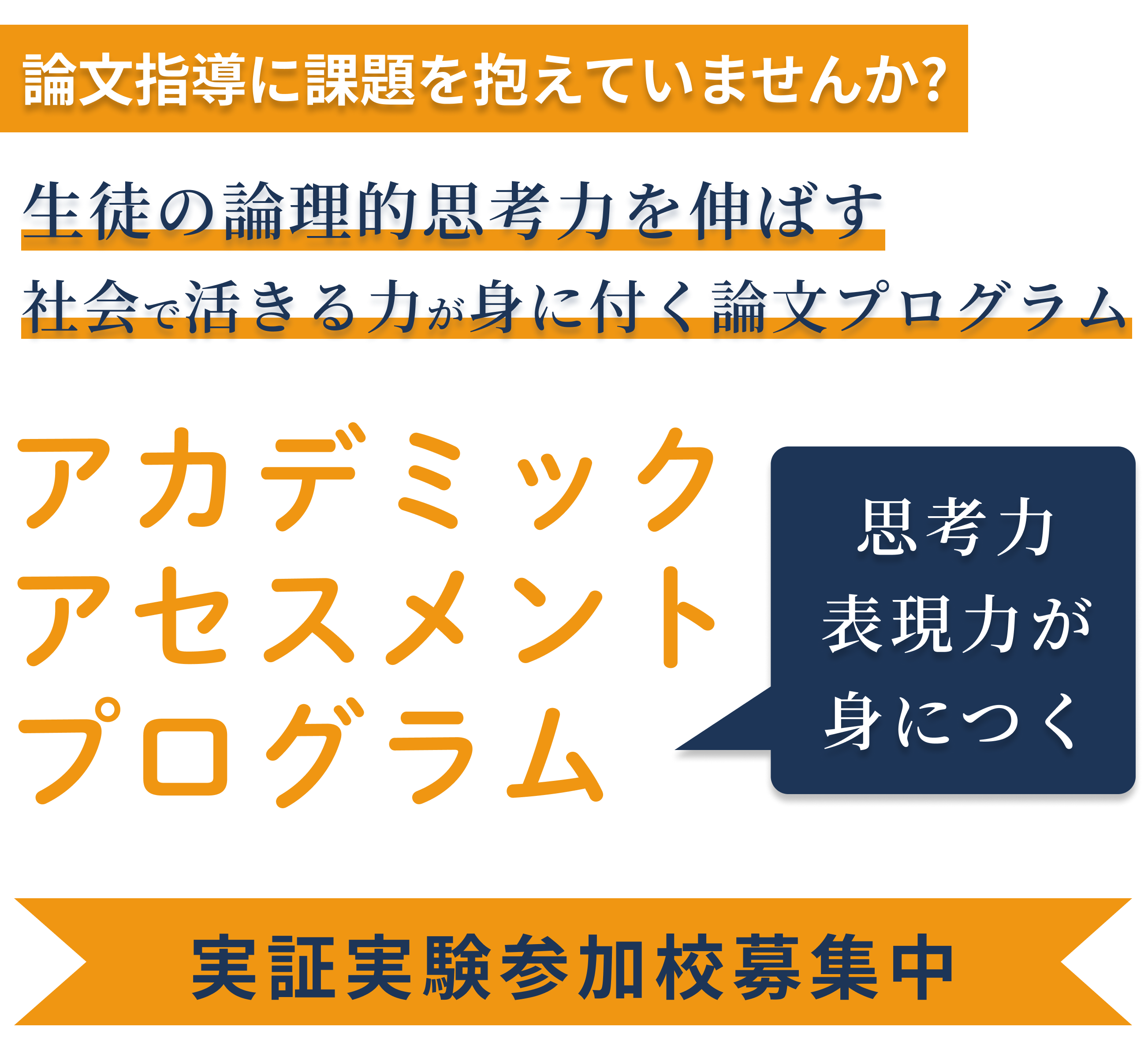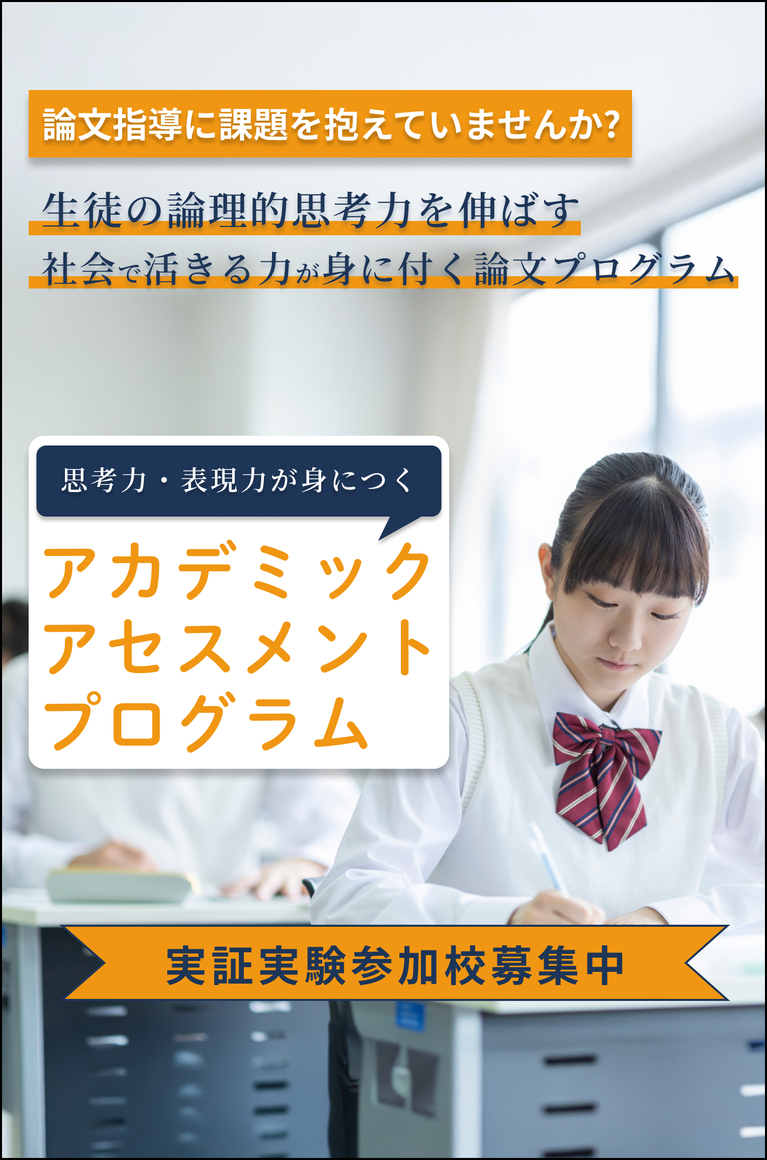 「知識を詰め込むだけでは、これからの社会を生き抜くには不十分です。自ら考え、表現し、他者と協働しながら課題を解決する力こそが求められます。 アカデミックアセスメントプログラムは、そうした“生きた思考力”を育て、それを形にすることを目的とした実践的な学習プログラムです。 生徒一人ひとりの可能性を引き出し、受験対策にとどまらず、将来にわたって役立つ力を育てるきっかけとして、ぜひ活用していただきたいと願っています。」